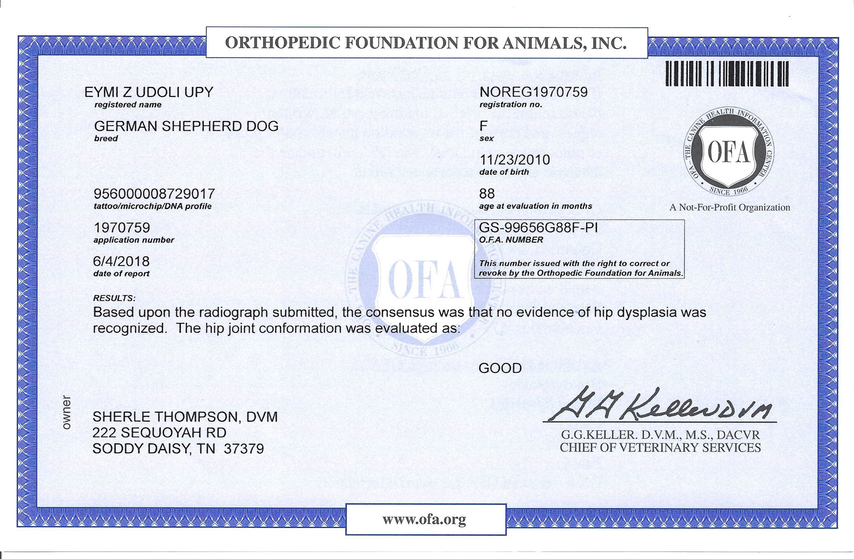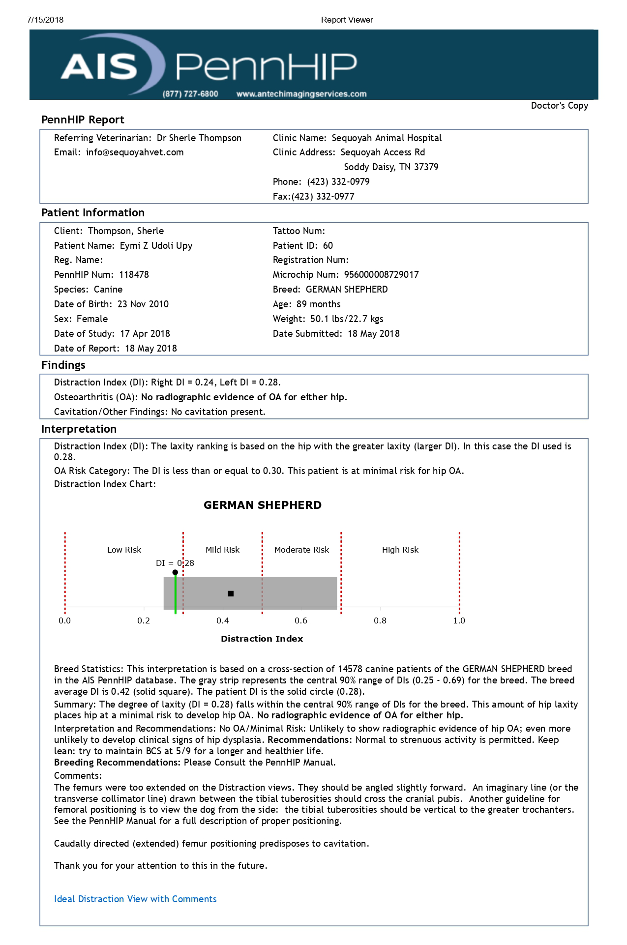 Current PennHip Scores: Top 10% of the breed and no evidence of arthritis at 89 months (7 ½ years of age)