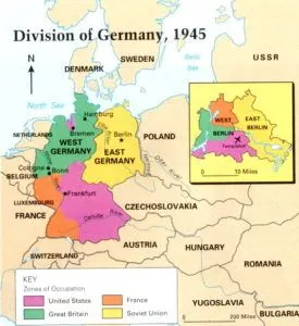The three western occupation zones (U.S., UK, and French zone) would later form the Federal Republic of Germany, commonly known as West Germany. And the Soviet zone became the German Democratic Republic (or Deutsches Demokratische Republik), commonly known as East Germany, both founded in 1949. West Germany was established as a federal democratic republic while East Germany became a Communist State under the influence of the Soviet Union. This fact set the stage for the Cold War which lasted for the next 46 years.