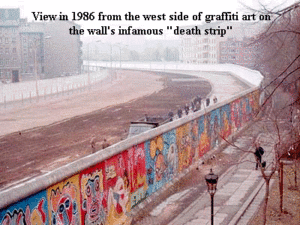 The main border between East and West Germany was sealed. However, because of its four-power status, Berlin remained open. East Germans seeking a better life could still leave for West Berlin and, from there, fly to West Germany. Of 17 million East Germans, 2.2 million fled westward between 1949 and 1961, most via the Berlin “escape hatch.” By mid-1961, this exodus threatened the Communist state’s very Berlin_wall_1existence. Hence, the Berlin Wall.