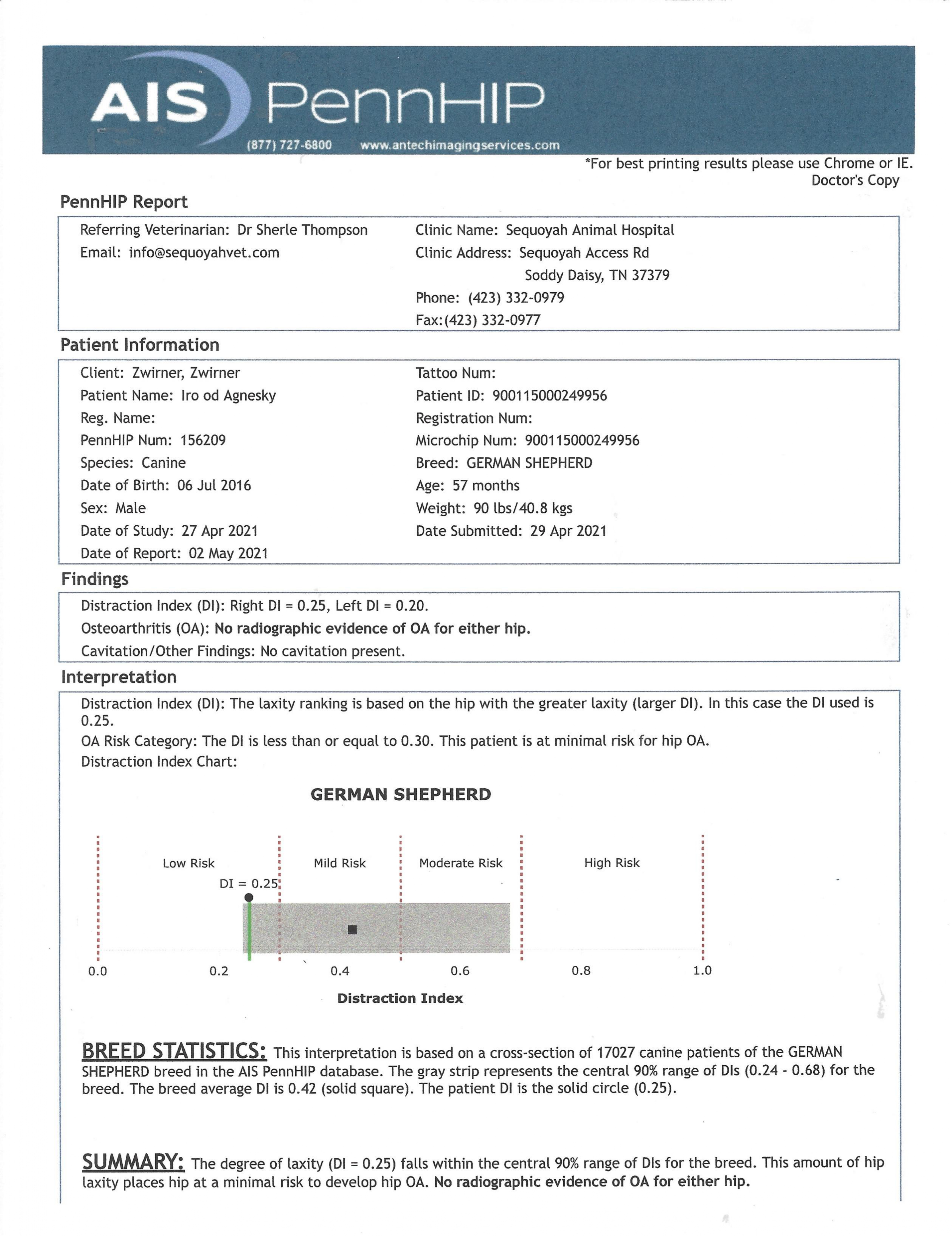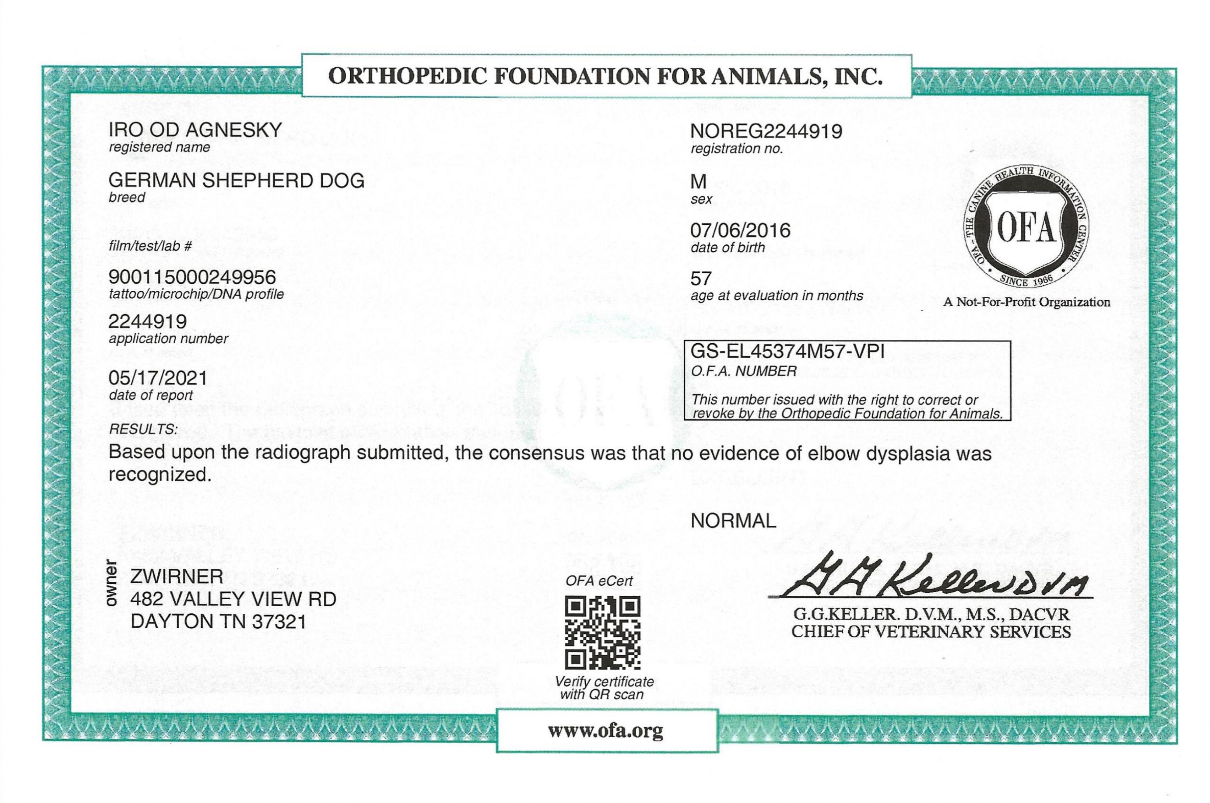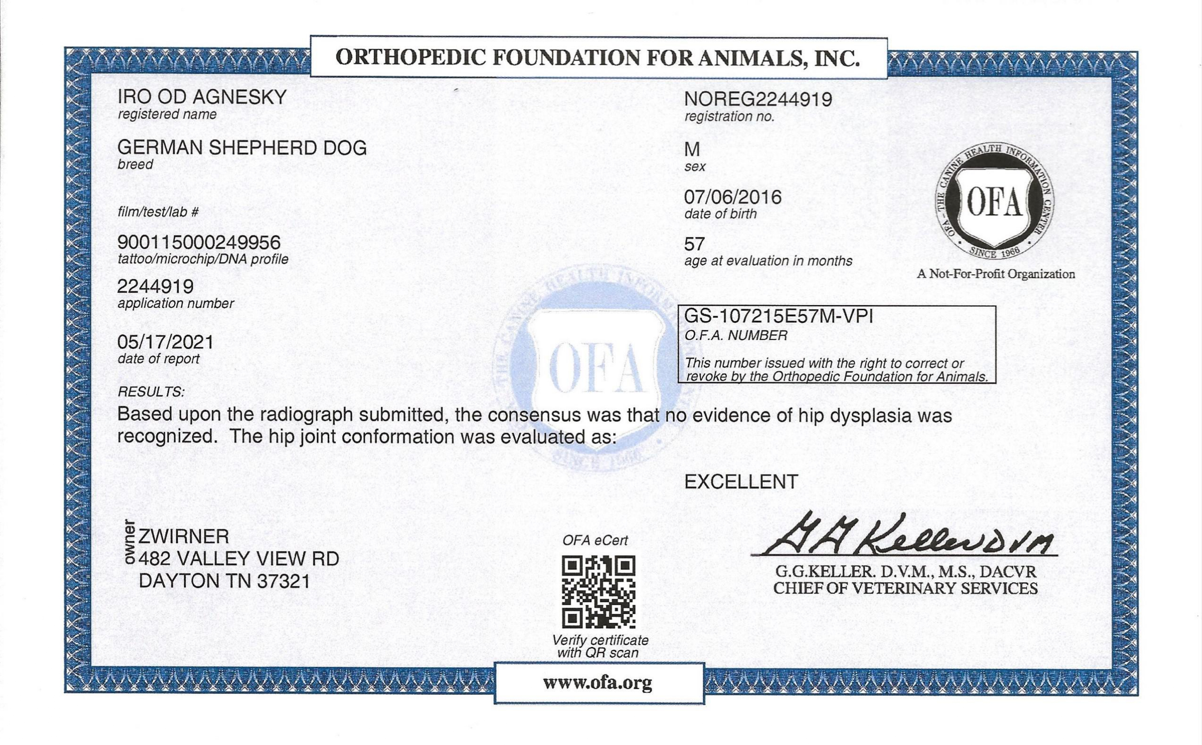 Iro is OFA excellent at 5 ½ years of age