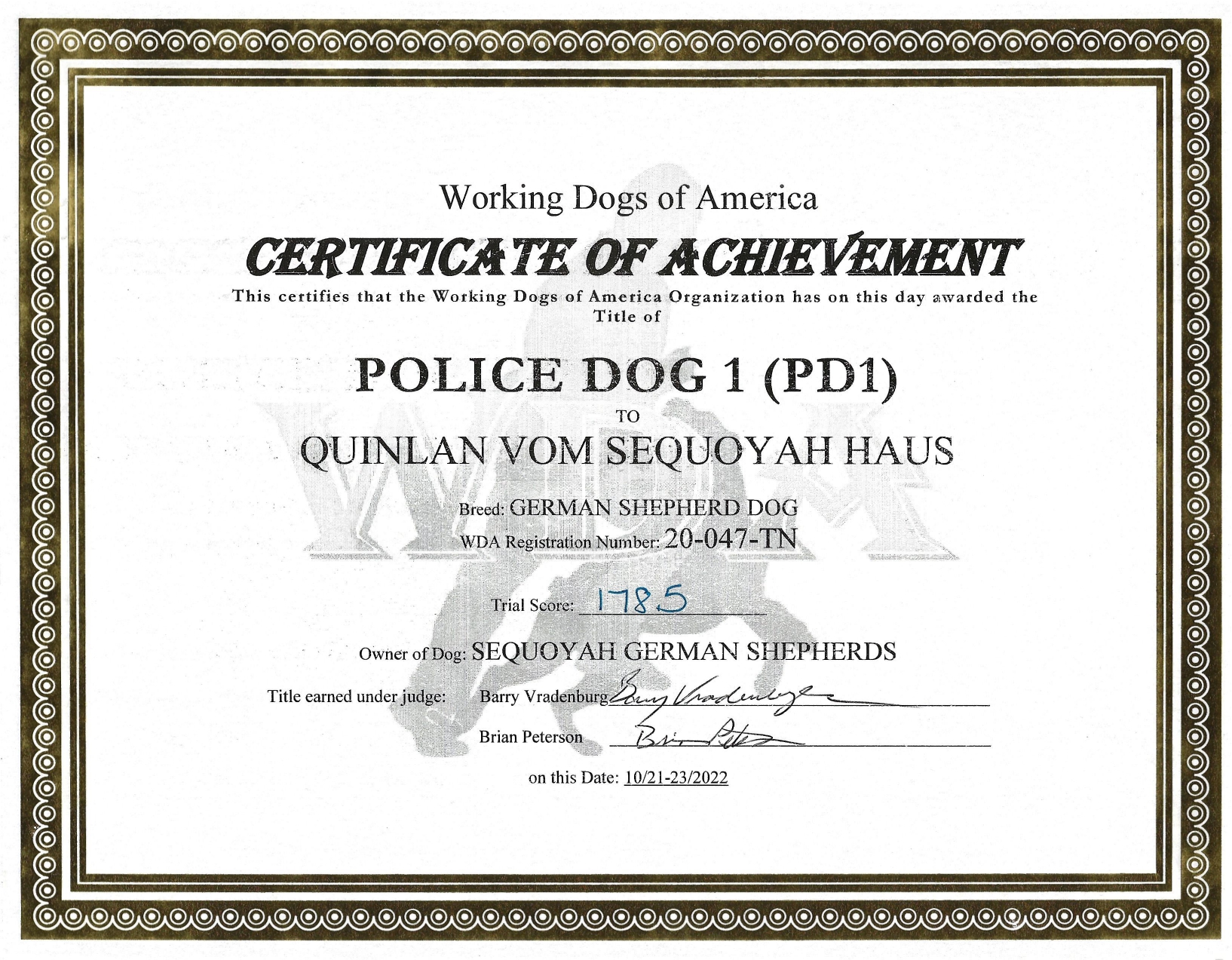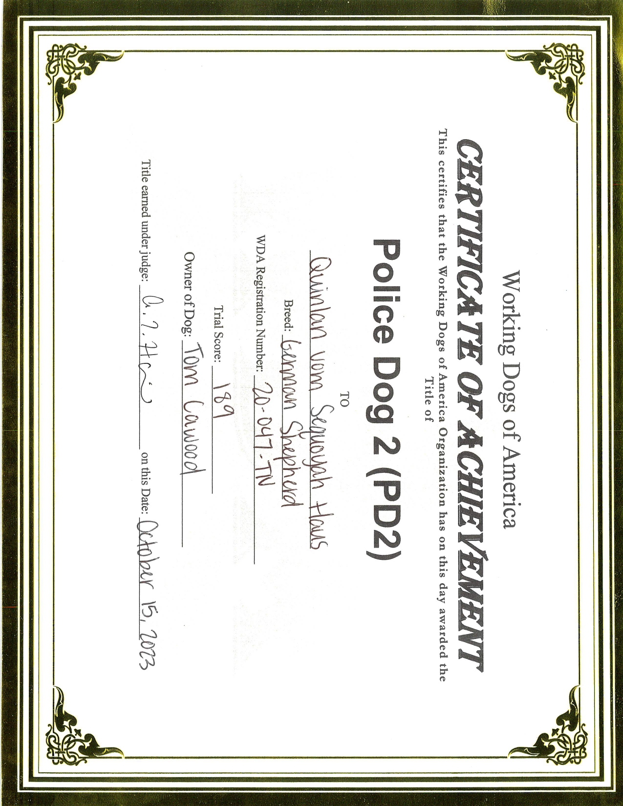 - Currently in training with Tom Cawood for his Police Dog 3 title