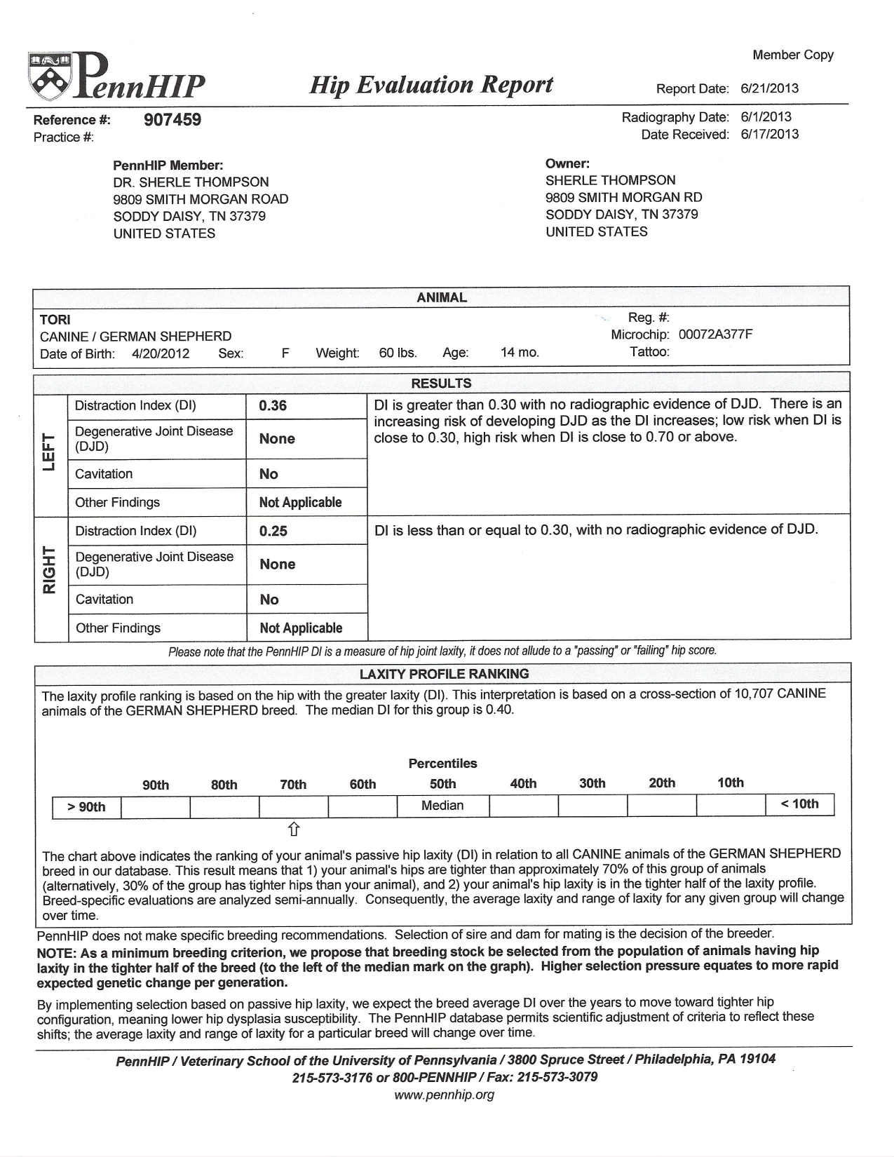 PennHip Scores: Top 30% (best hip is at top 1%)