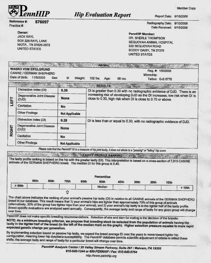 Wasko is that he is a proven producer of working drives, excellent pigment, large size and good health! He is one of the most extreme working dogs in the world. Gary Hanrahan titled Wasko to Schuthund 3 and described Wasko as a Lion of dog with the only problem being that Wasko extreme drives make it very difficult to get him ready for a major championship. Gary said he had to work Wasko everyday to maintain good control; Gary was also told by the helpers in the 2006 German Shepherd Championship that Wasko was the most intense dog in the championship concerning protection.